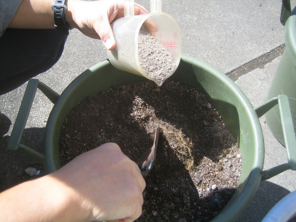 今回使用するプランターは土が15L入っているので、300mL混ぜました。