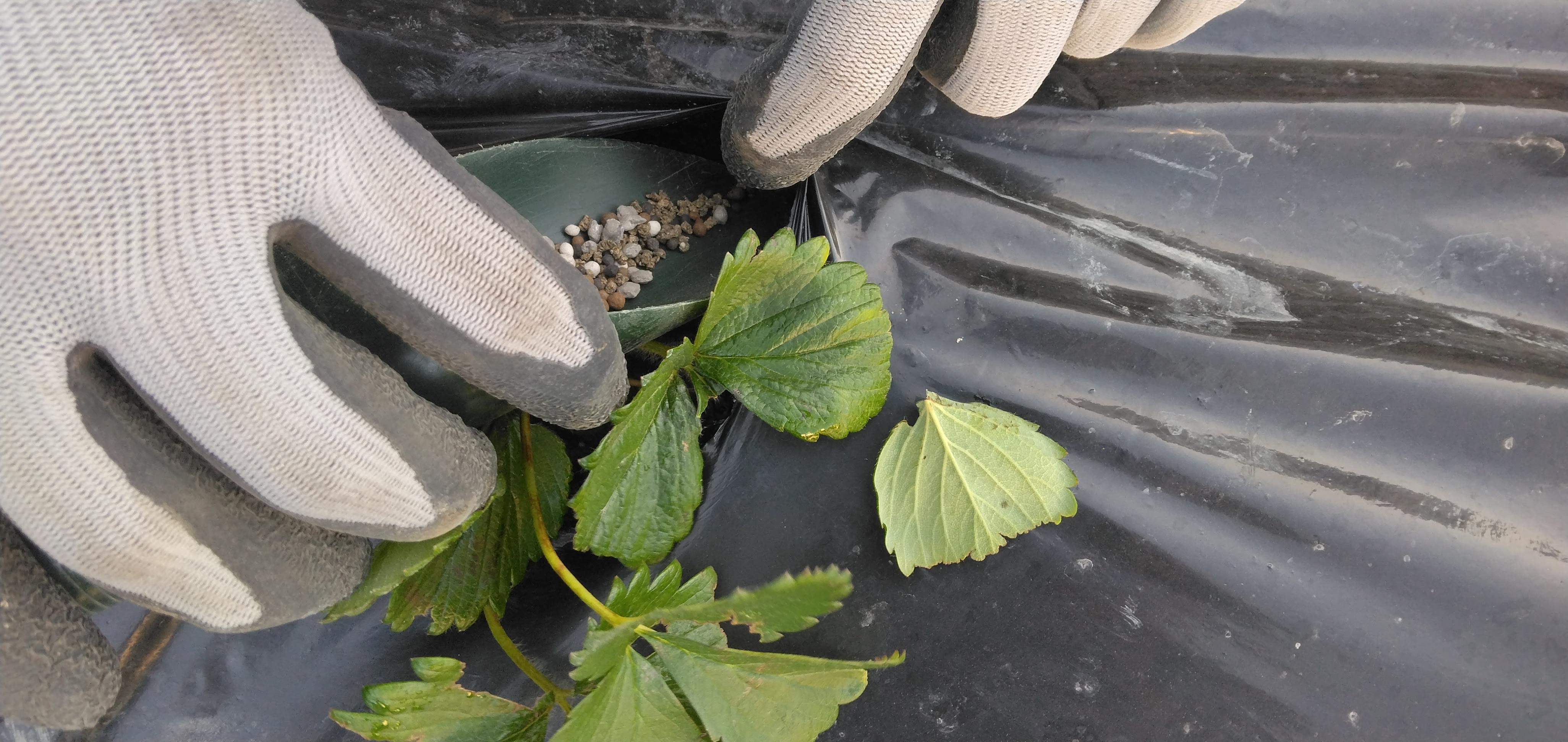 イチゴの株から少し離れたうね肩の部分に肥料をまきます。