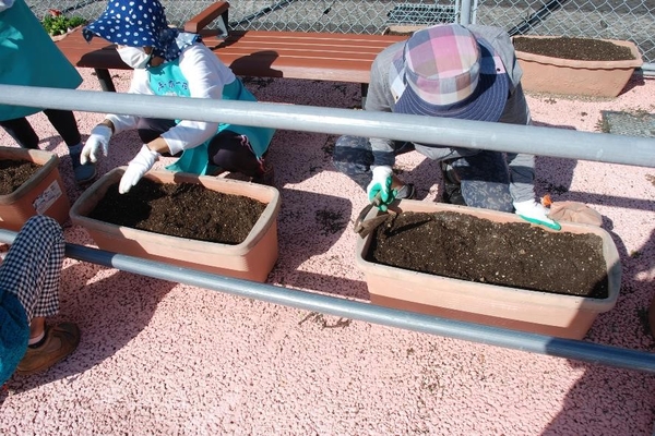 市役所前の三角花壇でも土づくり。今日は、会長さんがケガをされいるということでいらっしゃらなかったのですが、みんなで話合いながら土づくりをされていました。