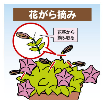 ペチュニアの名前の由来は、ペチュニアと同じ種類(科)のタバコをブラジルのグアラニ語で 『ペチュン』と呼ぶところから来ています。 ペチュニアの魅力は初夏から秋までの長い開花期間と花色の多さです。 そのため花の咲く花苗が少ない夏場の花だんやプランターに欠かせない花苗です。 ここではそんなペチュニアのお花が『なが〜く・いっぱい』咲くコツをイラストを使い解りやすく説明いたします。 是非ご参考にして下さい。