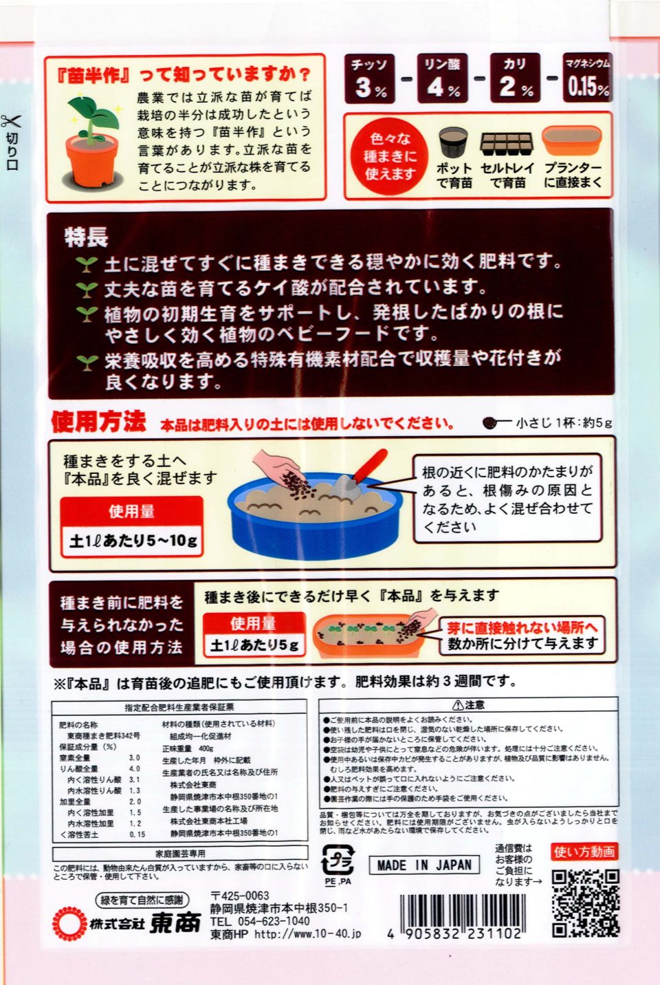 | プロが育てたような 立派な苗を育てる 野菜と花の種まき時に使う肥料 | 120g・400g | | ※この商品は製造終了となりました | | N:3・P:4・K:2・Mg:0.15 | | |  | | 内容物イメージ