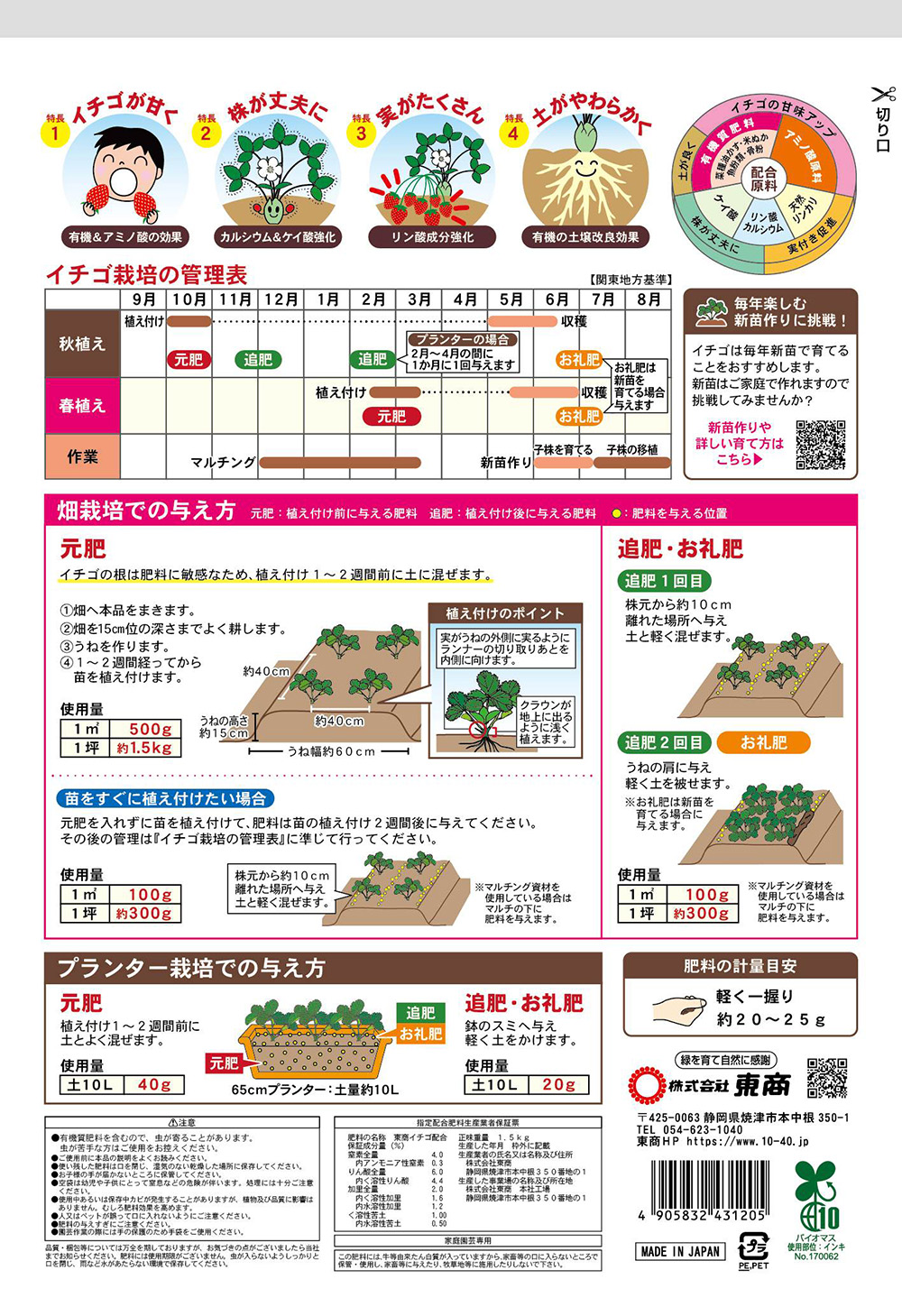 特長1さらに、アミノ酸の働きにより、株の成長に必要な糖の消費を軽減するため、生成された糖分が果実に集中し、甘く美味しいイチゴが育ちます。 特長2![]() 特長3![]() |