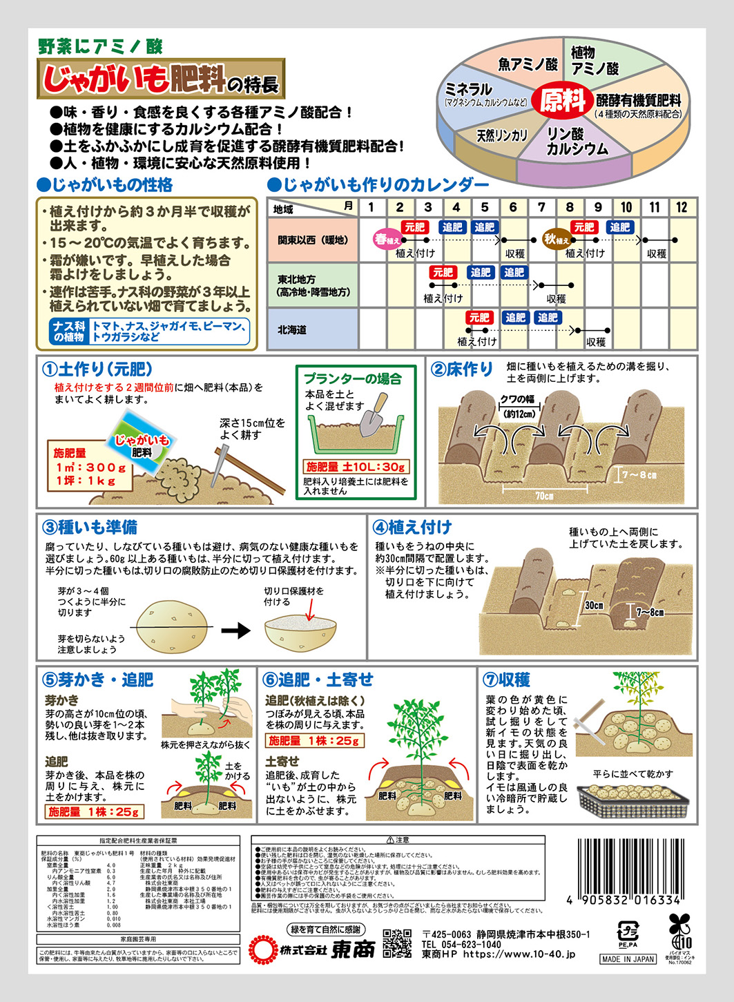 特長 18種類以上のアミノ酸がおいしいじゃがいもを育てる 『本品』に含まれる18種類以上のアミノ酸の相乗効果で、甘くて風味の良いほくほくしたジャガイモが育ちます。
