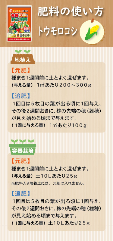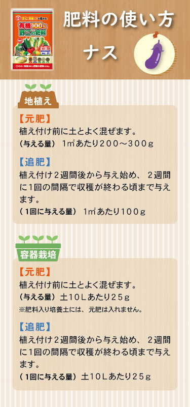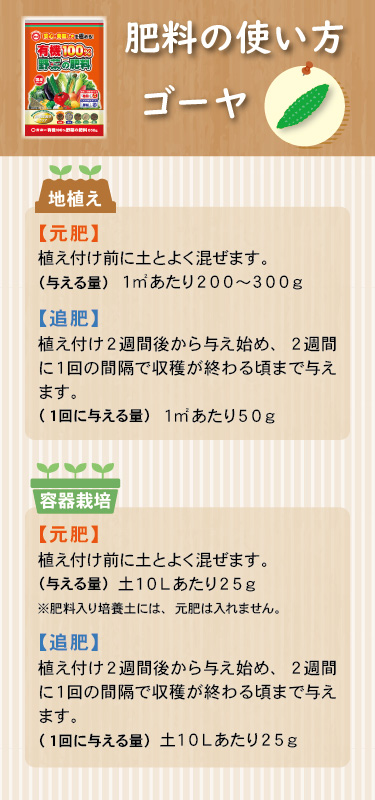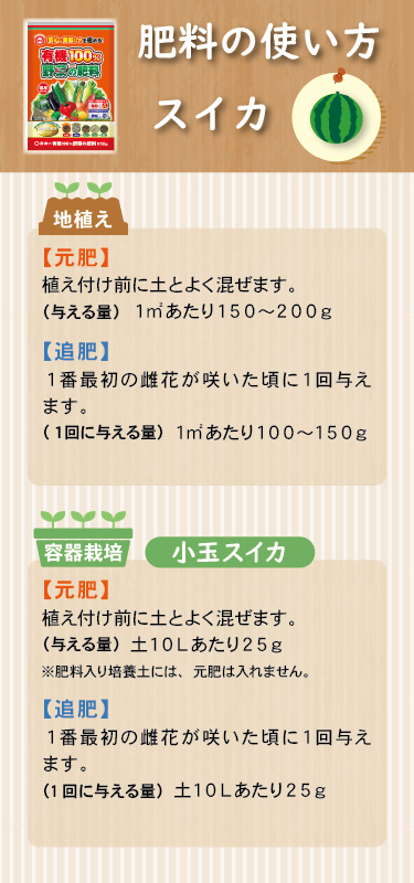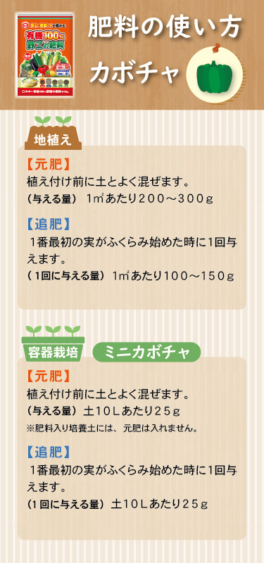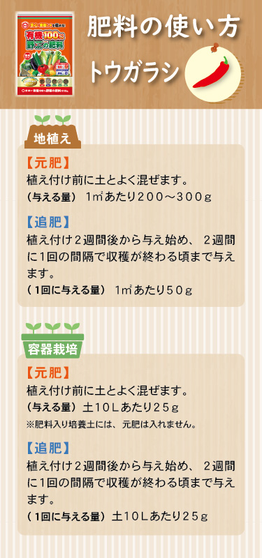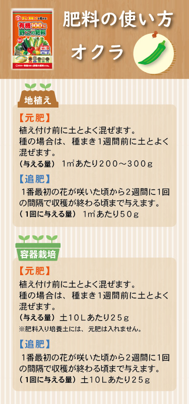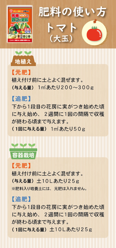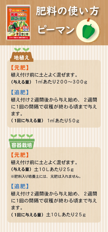 | 施肥方法 | 〇菜園・容器栽培共通 元肥 | 苗の場合 | 植え付け前に土へ混ぜます | | 種の場合 | 種まき1週間前に土へ混ぜます | 追肥 | 苗の場合 | 植え付け3週間後から 2週間に1回与えます | | 種の場合 | 種まき4週間後から 2週間に1回与えます | | | |