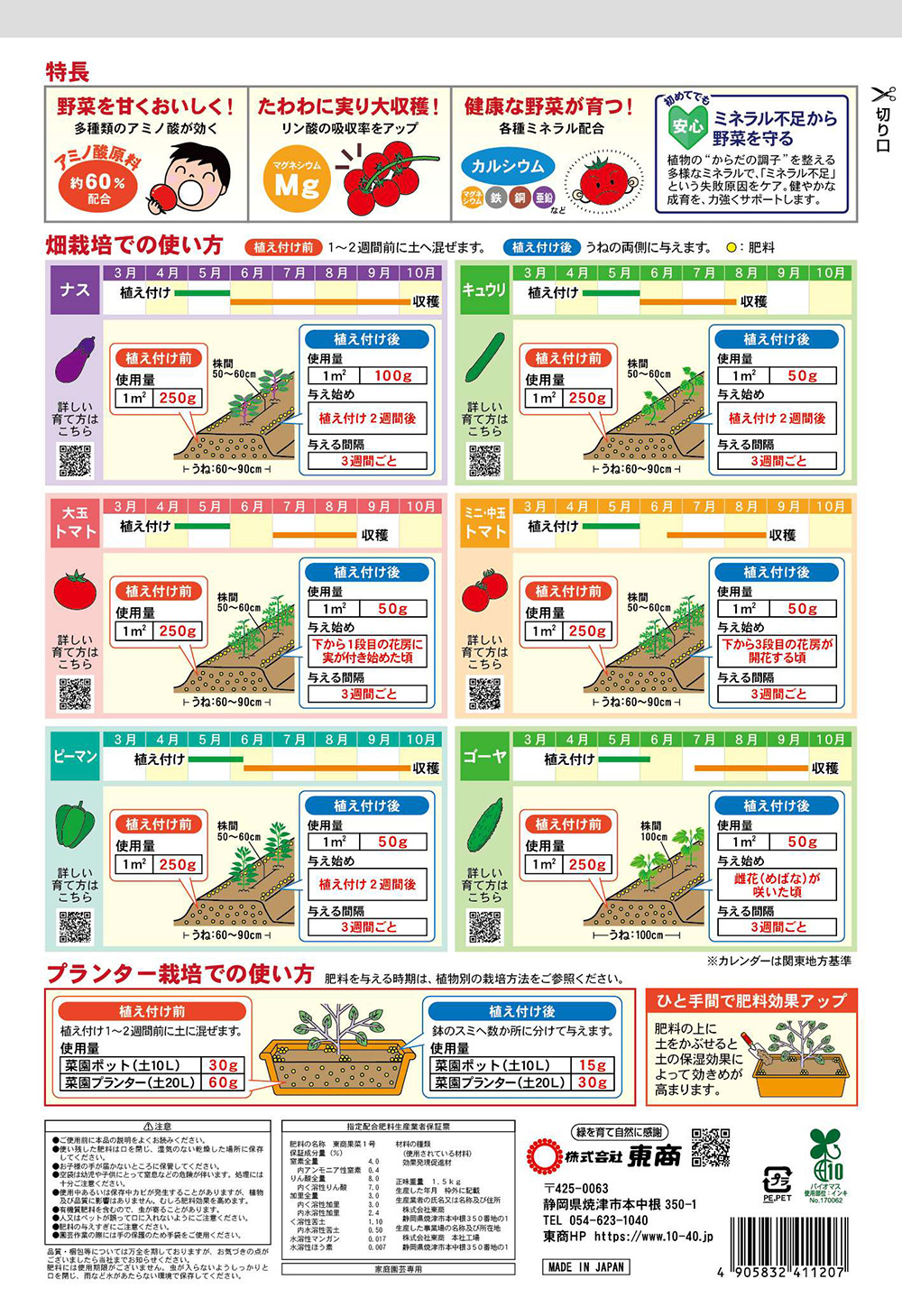 | 野菜を甘くおいしく! アミノ酸原料約60%配合 | | 450g・1.5kg(2kgは製造終了) | | N:4・P:8・K:3・Mg:1.1 | | 【パッケージ裏面】 | 450g | 1.5kg | | 内容物イメージ | |