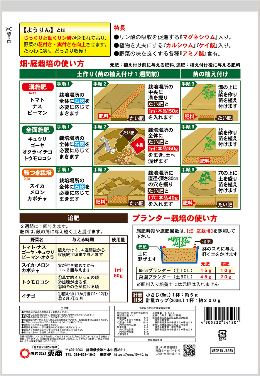 | ようりん入り化成肥料で どっさり収穫 | | 500g・1.5kg | | N:6・P:10・K:6 | | | | 内容物イメージ  | |